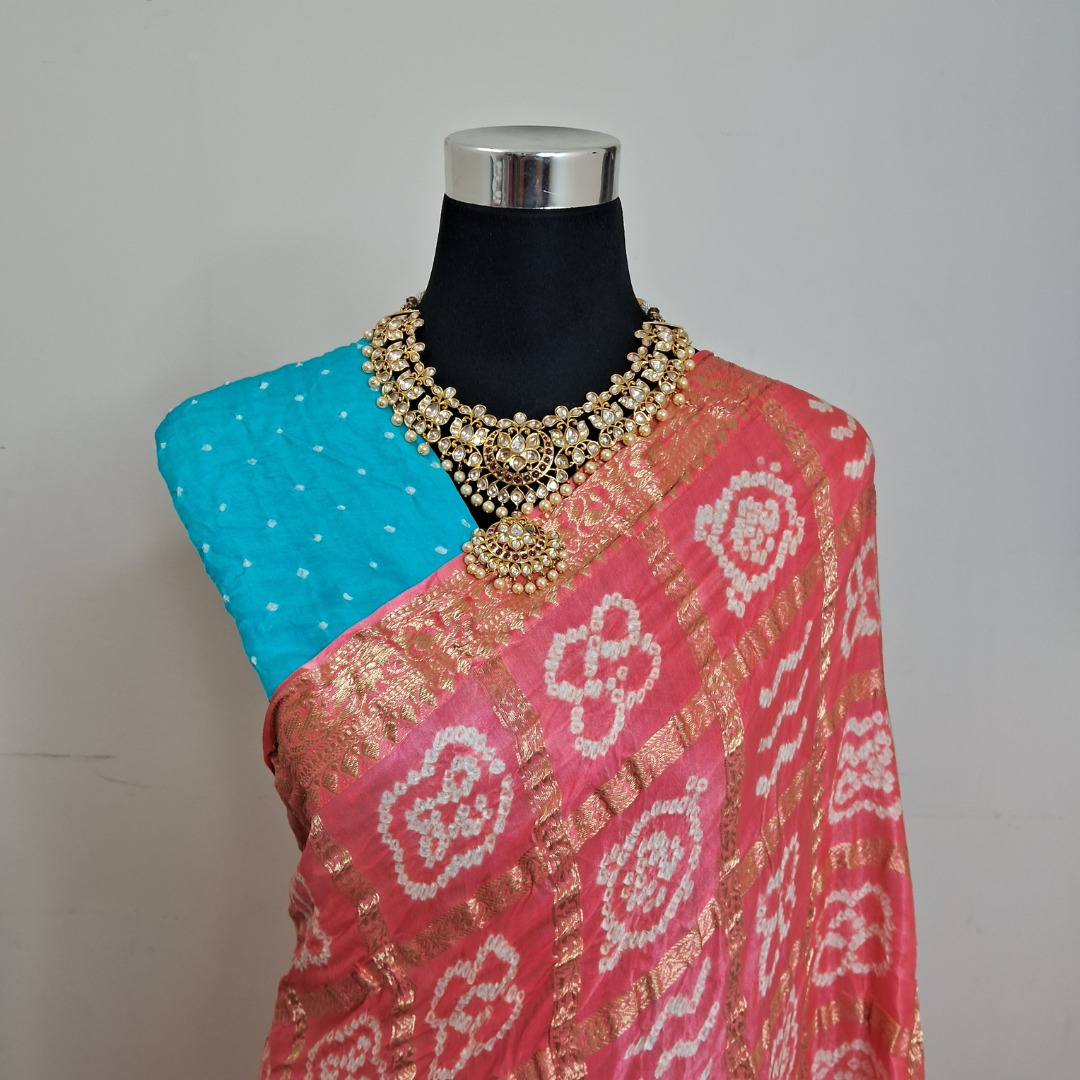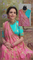 Crafted from luxurious Gajji silk, this bandhani saree showcases traditional tie-dye artistry that creates a mesmerizing pattern across the fabric. The detailed Nakshi elevates its sophistication, making it an ideal choice for weddings and celebrations.