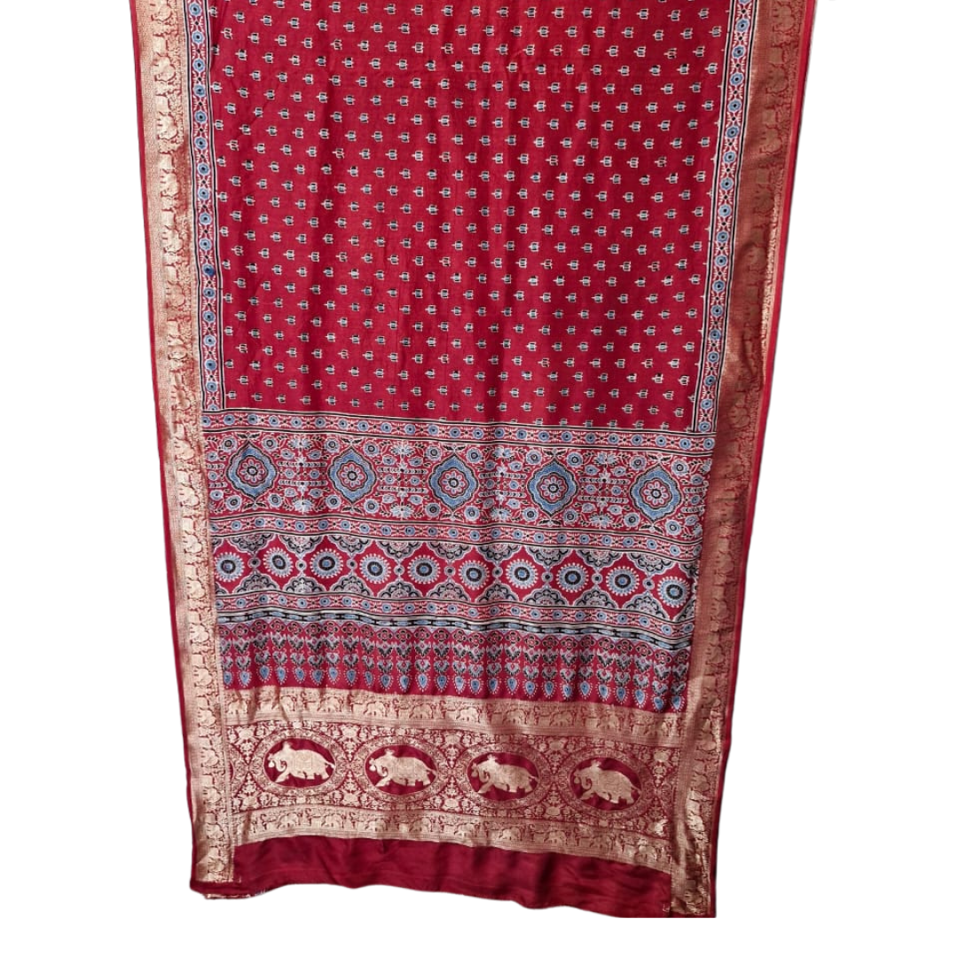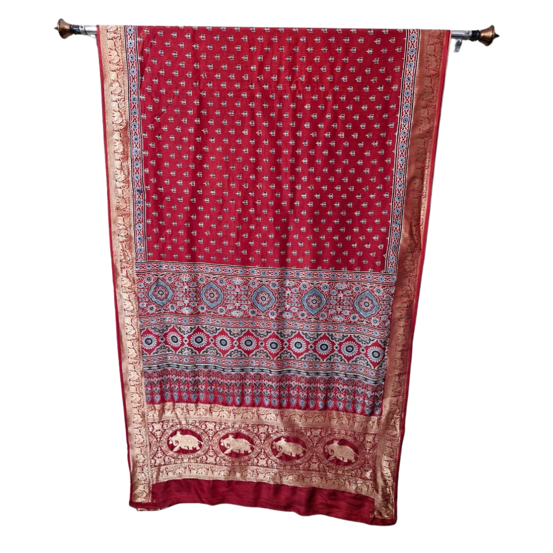 Sahaj celebrates the timeless artistry of Ajrakh block printing on luxurious dola silk. This saree features intricate hand-blocked patterns in natural, earthy tones that reflect traditional craftsmanship.