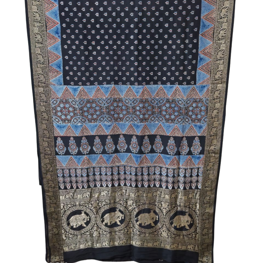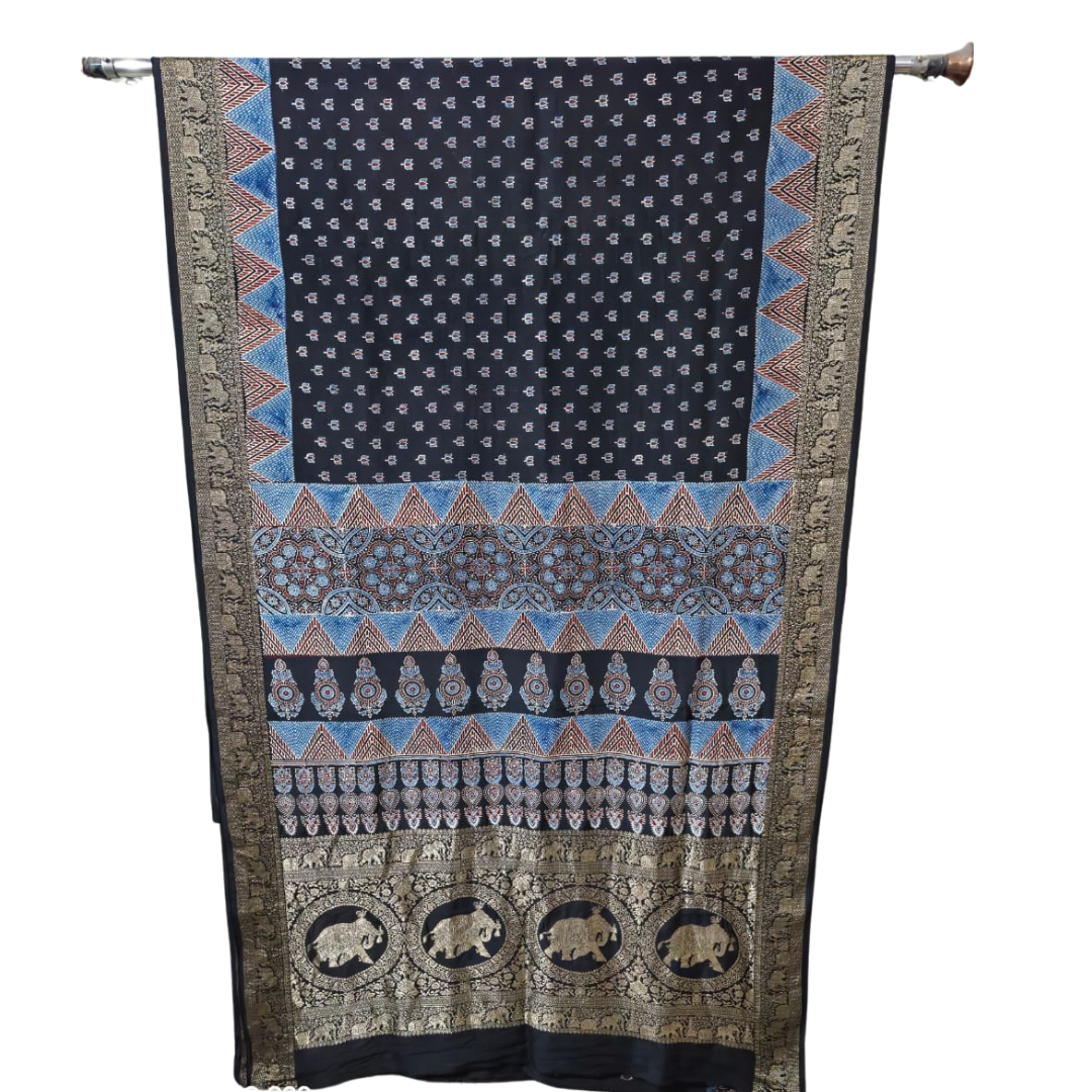 Sahaj celebrates the timeless artistry of Ajrakh block printing on luxurious dola silk. This saree features intricate hand-blocked patterns in natural, earthy tones that reflect traditional craftsmanship.