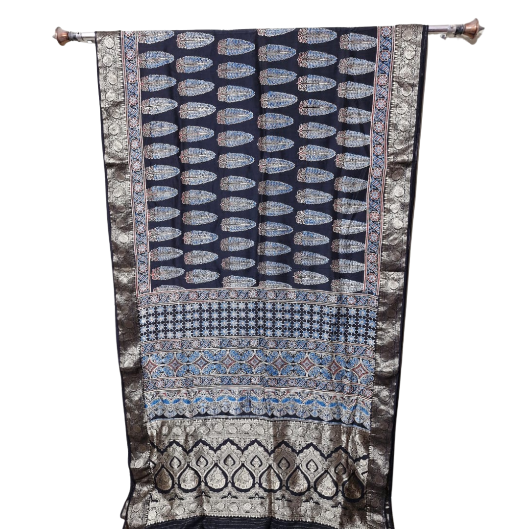 Sahaj celebrates the timeless artistry of Ajrakh block printing on luxurious dola silk. This saree features intricate hand-blocked patterns in natural, earthy tones that reflect traditional craftsmanship.